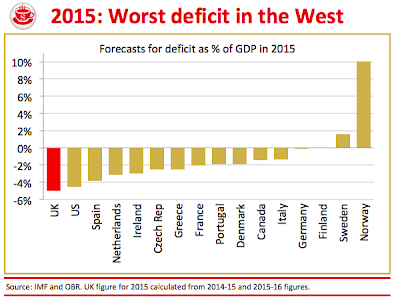 So the fact is that despite all the coalition government’s austerity measures our deficit is rising at such a rate that Britain will have the worst deficit in the Western world by 2015 (see chart). And this means that our national debt is getting bigger, bigger and bigger every year.