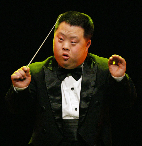 [Picture shows Down's Syndrome performer Hu Yizhou from the China Disabled Peoples Performing Art Troupe conducting at a rehearsal for a concert in Seoul in this March 2004 photo. REUTERS/You Sung-Ho]