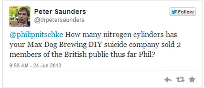 I hope it is not the first barbiturate or nitrogen suicide of someone in the UK making use of his information and equipment. But I am not holding my breath.